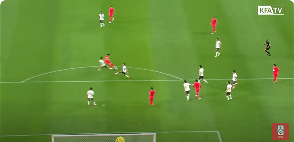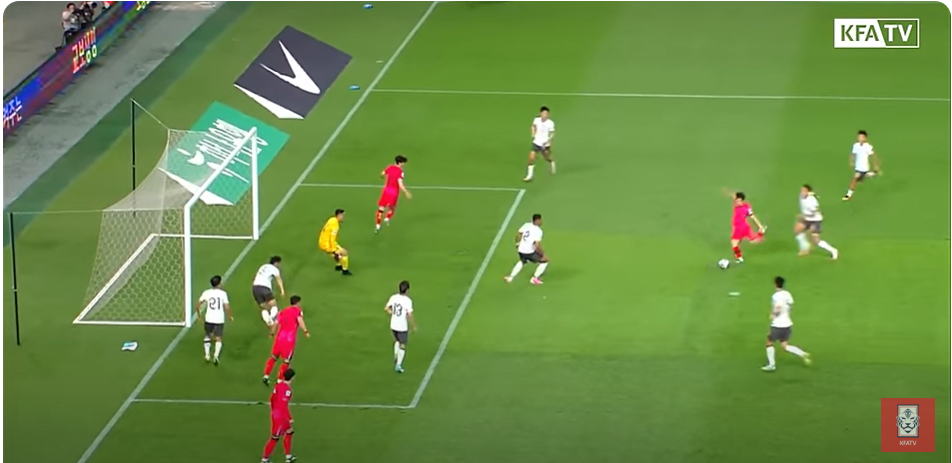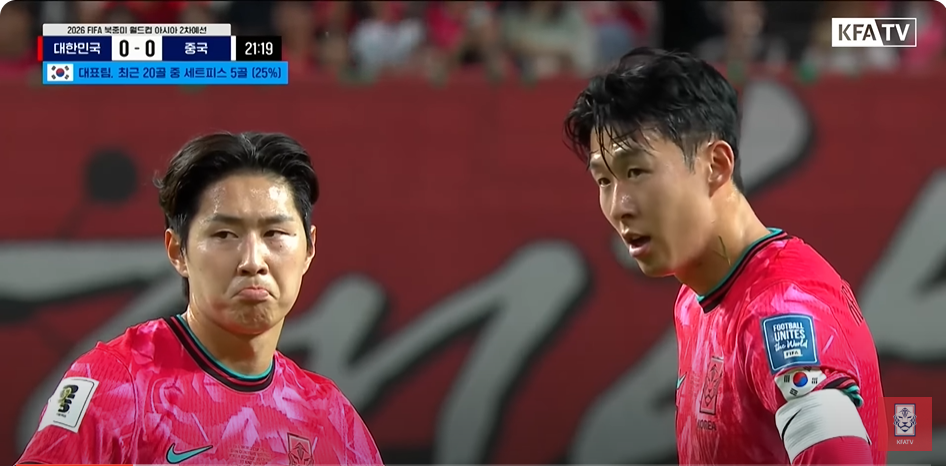 곧이어 전반 20분경 중국 수비수가 손흥민을 밀어 박스권 정면 바로 밖에서 프리킥 찬스를 얻었는데요. 손흥민 이강인이 Y자 형태로 프리킥 대기 후 손흥민이 슛을 했지만 수비수 몸을 맞고 굴절되어 코너킥이 되었고 골로는 연결되지 않아 아쉬운 장면이 되었습니다.