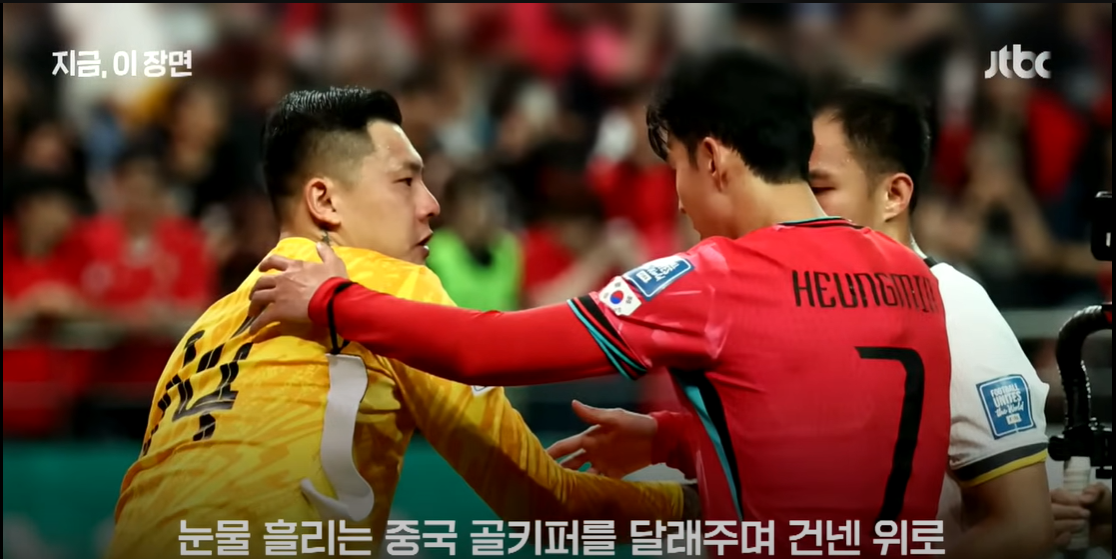 그러나 우리의 캡틴 손흥민 선수는 끝까지 중국의 도발에 휘말리지 않았고 오히려 경기 종료 후 울고 있는 상대 골키퍼를 안아주며 위로하는 등 인성 또한 월드 클래스임을 증명했습니다.